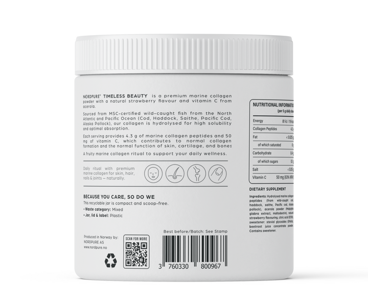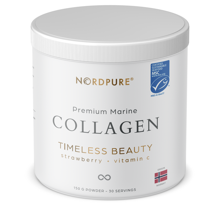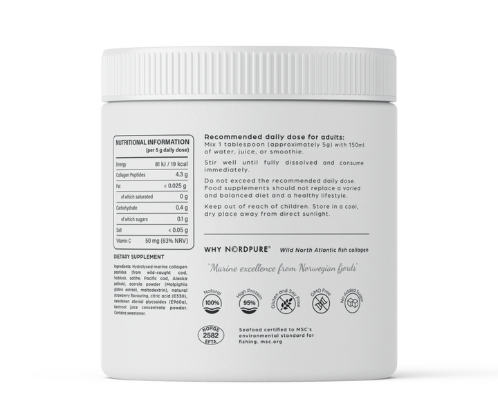 Premium marine collagen powder with natural strawberry flavor and acerola vitamin C. Wild-caught in Norwegian waters, MSC-certified for sustainability.
