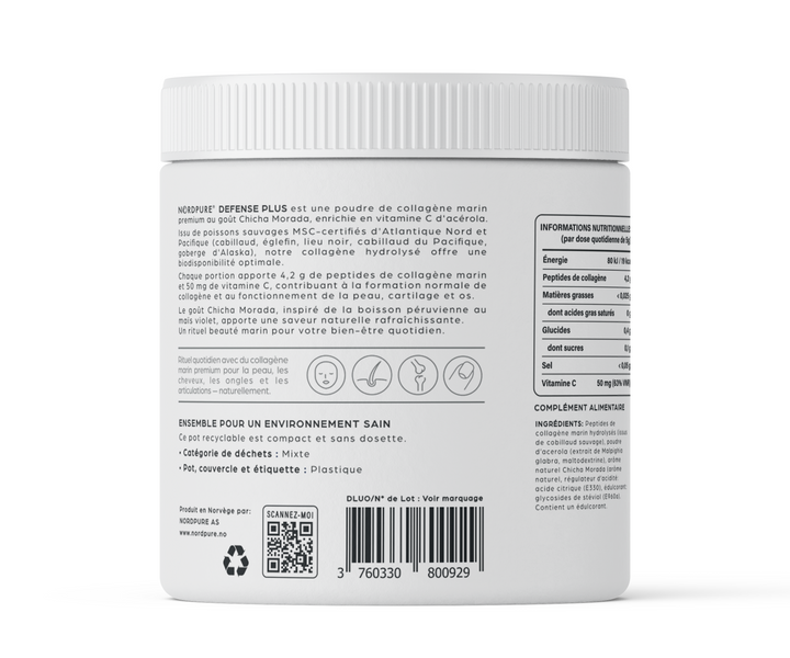 Poudre de collagène marin avec vitamine C naturelle d'acérola et arôme riche en antioxydants de chicha morada. Produite durablement en Norvège à partir de poissons sauvages certifiés MSC.